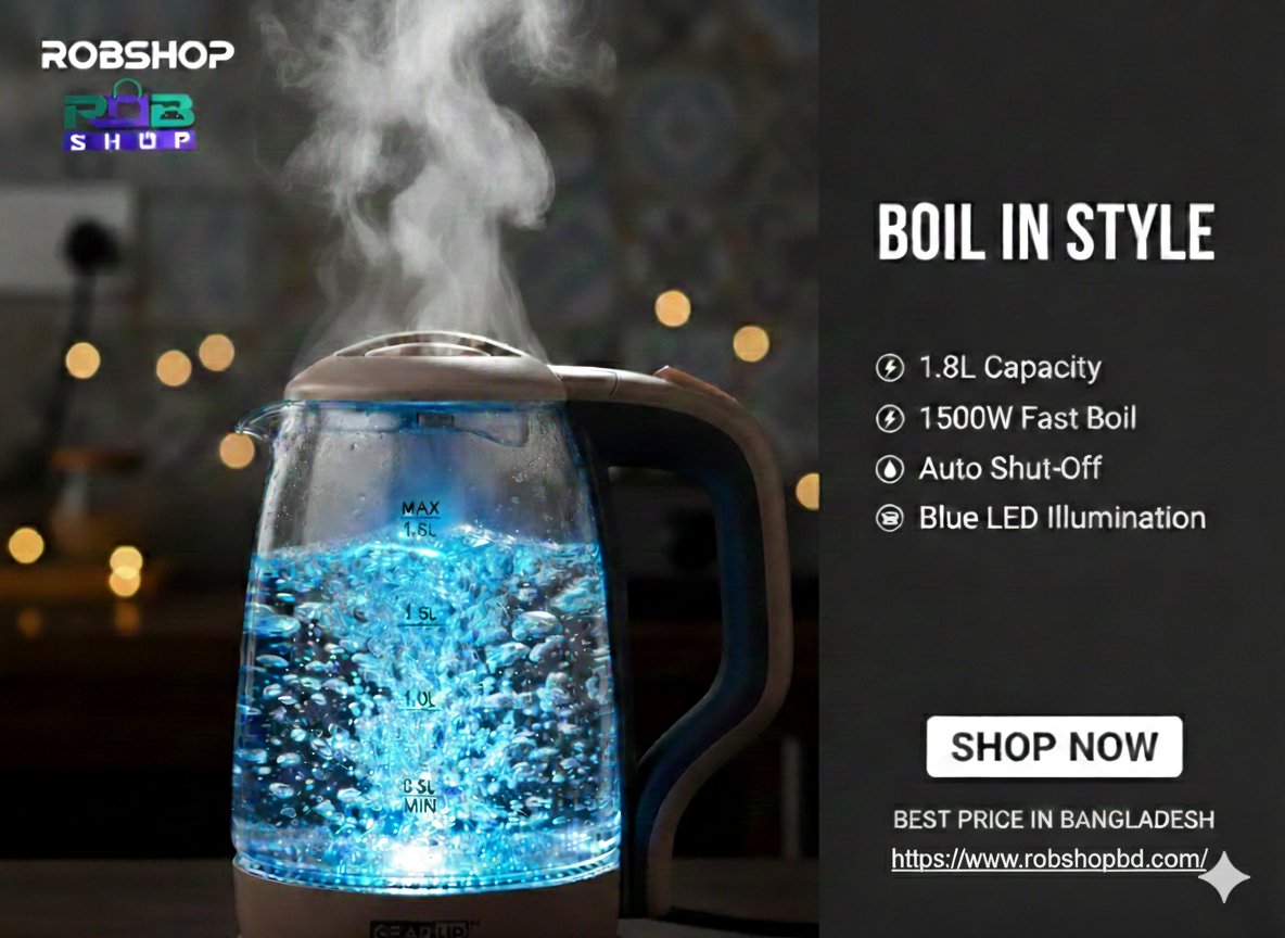 প্রিমিয়াম গ্লাস বডি: উচ্চমানের তাপসহনশীল গ্লাস ব্যবহার করা হয়েছে, যা পানি ফোটানোকে করে নিরাপদ ও স্বাস্থ্যসম্মত।